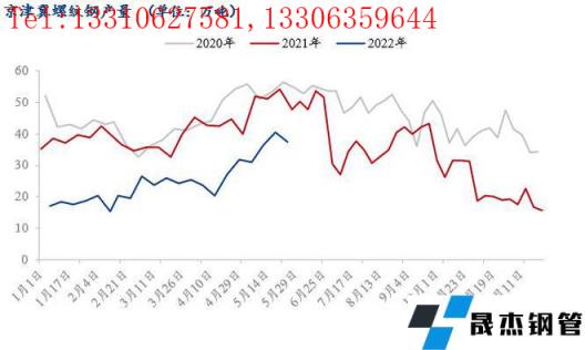 從上圖可以看出,5月份京津冀建筑厚壁無縫鋼管無縫厚壁鋼管廠家的螺紋鋼產量緩慢提升,雖然中下旬產量有所下降,但是仍處于相對高位,不過低于往年同期水平。截至5月底,螺紋鋼周產量為37.51萬噸,產量月環比提升17.6%,較去年同期低21.3%。本月除承鋼受當地疫情影響,原料運輸受阻,高爐有檢修情況,導致建材產量有所下降外,其他無縫厚壁鋼管廠家如敬業、東華、東海特鋼、樂鋼等月產量均有所提升,且隨著運輸情況緩解,無縫厚壁鋼管廠家廠內資源陸續向周邊市場分流。從調研情況來看,當前無縫厚壁鋼管廠家螺紋鋼生產成本在4500-4600元/噸,雖然利潤微薄,但是6月份也無檢修計劃,且產量或較5月份有提升。