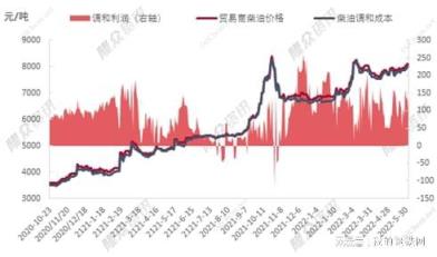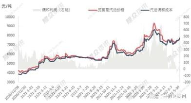 反觀柴油,依據(jù)華東江里貿(mào)易商 柴油價格及其原料價格走勢進(jìn)行監(jiān)測,2022年5月華東成品柴油原料價格同比出現(xiàn)1.5-2.5%的漲幅。在5月夏收帶動下,成品柴油價格同步上漲,致使柴油成本利潤均出現(xiàn)提升,但進(jìn)入6月份,隨著南方進(jìn)入梅雨季節(jié),需求逐步回落,柴油理論利潤或相應(yīng)收窄。見上圖3。