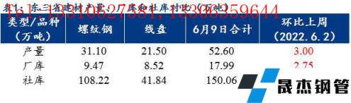 6月2日-8日本周東三省建筑厚壁無縫鋼管產量合計52.60萬噸,較上周增3萬噸;廠庫合計17.99萬噸,較上周增2.75萬噸;總社庫150.06萬噸,較上周增2.99萬噸。
