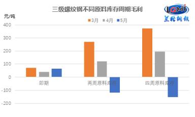5月份由于成本表現(xiàn)分化,市場(chǎng)均值震蕩下行,使得5月份品種噸鋼毛利相比上月有明顯差異。以三級(jí)螺紋鋼為例,以即期原料成本測(cè)算5月份毛利空間較上月上升25元/噸,以兩周、四周原料庫(kù)存周期測(cè)算5月份毛利空間均進(jìn)入虧損負(fù)值區(qū)間,兩周原料庫(kù)存周期測(cè)算毛利較上月減少239元/噸,以四周原料庫(kù)存周期測(cè)算5月份毛利空間較上月減少347元/噸(詳見(jiàn)圖2)。