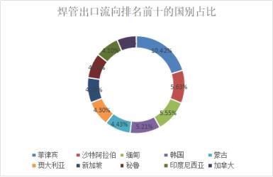 分地區(qū)來看,國內(nèi)厚壁鋼管出口市場主要集中在亞洲地區(qū),5月份在焊管出口量中占比小幅下降至59.05%;亞洲以外國別中美洲出口量占比小幅下降至16.42%。從國別來看,我國焊管的主要流向地區(qū)依次為菲律賓、沙特阿拉伯、緬甸、韓國、蒙古、澳大利亞、新加坡、秘魯、印度尼西亞、加拿大。較上月相比,菲律賓繼續(xù)排名首位;沙特阿拉伯增長79.50%,蒙古增長56.45%,加拿大增長72.87,相繼進入排名前十,智利下降67.09%跌出排名前十。從出口量排名前十的國別數(shù)量來看,亞洲占70%,美洲占20%,澳洲占10%。