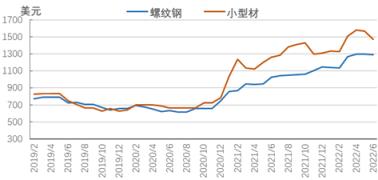 美國長材價格小幅下跌。6月底,美國中西部無縫鋼管廠家螺紋鋼價格下跌10美元至1290美元,進口螺紋鋼價格下跌175美元至1075美元;中西部無縫鋼管廠家小型材價格下跌95美元至1475美元,進口小型材價格下跌70美元至1360美元。美聯儲持續加息,利率的快速上調增加購房者負擔,將對房地產市場形成壓制,影響厚壁鋼管需求。紐柯厚壁無縫鋼管于6月14日宣布將線材價格下調40美元/短噸,美國厚壁無縫鋼管公司Optimus Steel宣布自7月1日起其線材價格下調40美元/短噸。綜合來看,7月份北美市場長材價格或延續震蕩調整走勢。