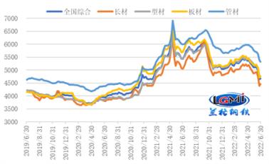 6月份,市場需求淡季特征較為明顯,北方高溫和南方雨季都影響了正常的施工節(jié)奏,下游實際采購需求釋放力度受限嚴重,疊加成本支撐力度的減弱,國內(nèi)厚壁鋼管市場呈現(xiàn)明顯的弱勢下跌行情。據(jù)云商平臺監(jiān)測數(shù)據(jù)顯示,截至6月底,全國厚壁鋼管綜合價格為4672元,較上月末下跌412元,環(huán)比跌幅為8.1%,年同比下跌14.0%。其中,長材價格為4452元,較上月末下跌404元,跌幅8.3%,年同比下跌11.9%;板材價格為4755元,較上月末下跌415元,跌幅為8.0%,年同比下跌16.5%;型材價格指數(shù)為4750元,較上月末下跌432元,跌幅為8.3%,年同比下跌12.8%;管材價格為5311元,較上月末下跌421元,跌幅為7.4%,年同比下跌11.4%(詳見圖1)。