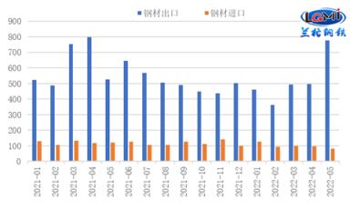 進口方面,由于國內(nèi)疫情對制造業(yè)的沖擊仍存,且海外市場價格優(yōu)勢不足,進口仍呈下降態(tài)勢。5月份,我國進口厚壁鋼管80.6萬噸,環(huán)比下降16.0%,同比下降33.2%;1-5月累計進口厚壁鋼管498.0萬噸,同比下降18.3%。