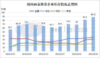 截止2022年6月24日,據(jù)云商平臺監(jiān)測數(shù)據(jù)顯示,國內(nèi)熱軋卷板社會庫存量約為264.53萬噸,環(huán)比增加20.82萬噸。重點(diǎn)城市庫存整體表現(xiàn)不一,華東區(qū)域受上海復(fù)工復(fù)產(chǎn)影響小幅消庫為主,華北、華南庫存持續(xù)累庫。具體來看,廣州地區(qū)熱卷社會庫存量約為71.00萬噸,環(huán)比增加9.09萬噸;上海熱卷社會庫存量環(huán)比下降4.84萬噸至37.00萬噸;天津熱卷社會庫存量約為8.00萬噸,環(huán)比增加0.80萬噸。