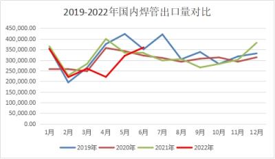 據(jù)海關最新統(tǒng)計顯示,2022年6月我國出口焊管35.96萬噸,環(huán)比增長12.18%;進口焊管1.11萬噸,環(huán)比增長5.97%;凈出口焊管34.85萬噸,較上月增長11.02%。1-6月凈出口量172.12萬噸,同比下降5.64%,處于三年均值以下水平,6月出口量在國內焊管產量的占比回升至6.82%。